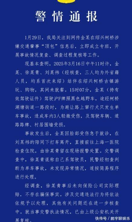 1月29日,绍兴市公安局柯桥区分局注意到网络上传的关于金某在柯桥涉嫌交通肇事“顶包”的消息,随即展开了调查。据了解,2025年3月16日中午,金某、徐某青和刘某祎一同在柯桥古镇玩耍。那天15点07分,金某为了躲避窜动的狗,发生了一起单车事故,导致车辆和车里的人有些轻微受伤,也造成车辆损坏。