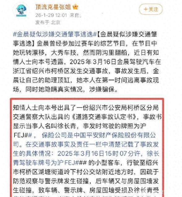 2026年1月29日,“金晨疑似交通肇事逃逸”这个话题一时间冲上了热搜,瞬间引起了众人的关注。多家官方媒体都报道,说在2025年3月16日,金晨在浙江绍兴柯桥区湖塘街道岭下村出了一次交通事故,撞到了路上的警示牌和房屋的围墙,车辆和一些公共设施都受了损。